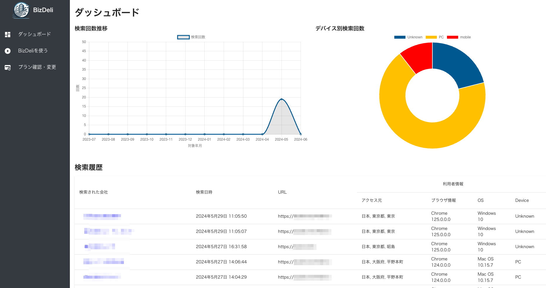 会社情報の検索履歴、検索された会社の業種や従業員数、ブラウザやOSなどの詳細情報を専用ダッシュボードで確認することが可能です。 これらの情報により、問い合わせに繋がった会社情報はもちろん、入力途中で離脱したユーザーの情報を把握しフォームの改善や営業活動に活かすことができます。 ※会社詳細情報の一部は取得できない、または推定値である場合がございます。
